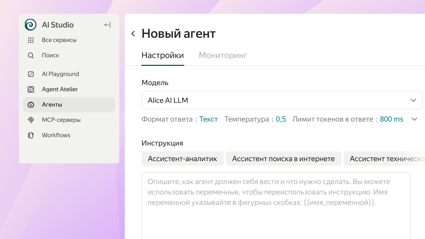 Подберите модель и подключите инструменты через Agent Tools.
