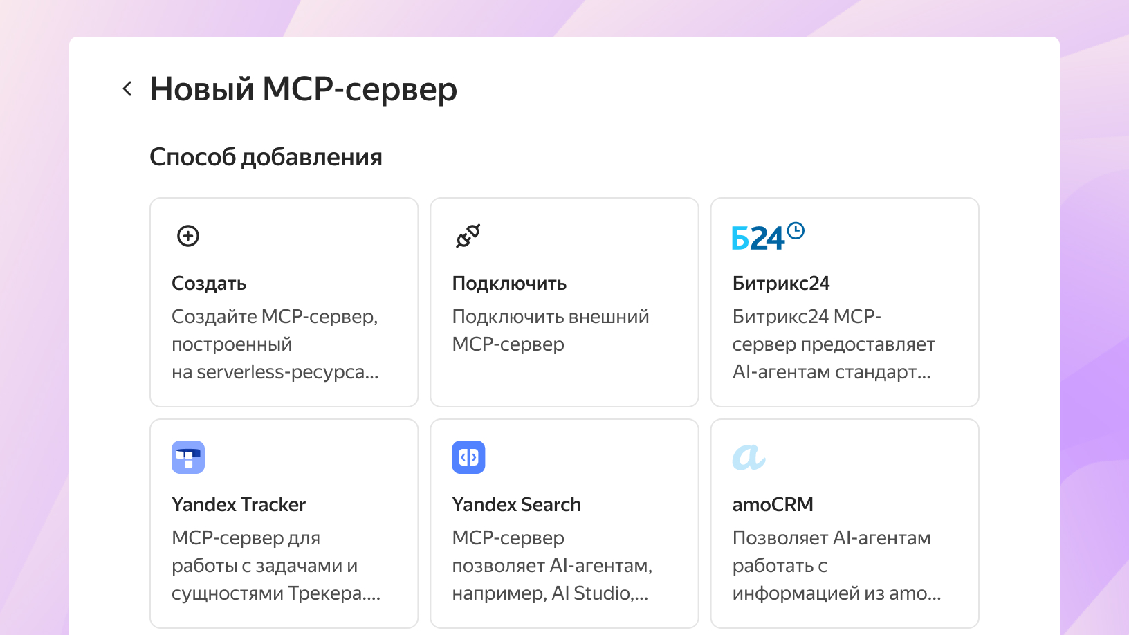 Слой интеграций для подключения агентов к внешним системам. Включает готовые коннекторы к популярным российским сервисам (amoCRM, Контур.Фокус, Яндекс Трекер, Битрикс24) и возможность создавать собственные MCP-серверы для расширения функциональности агентов.